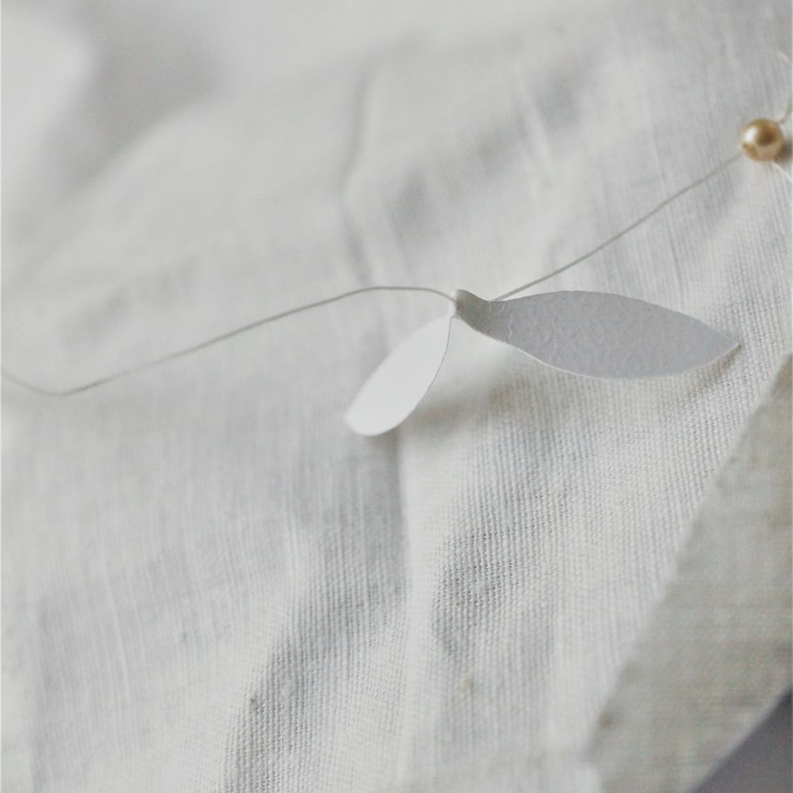 Sucht euch ein Stück weißes Papier oder einen leichten Tonkarton. Faltet ihn und zeichnet zwei Blütenblätter auf und schneidet sie so zusammenhängend aus, wie auf den Fotos. Die Höhe des Kartonstreifens sollte etwa 2 cm haben …. ich finde .. je kleiner die Blüte……. je schwieriger. … Sie sieht dann auch besonder fein aus …..legt die beiden Teile wie auf dem Foto übereinander, so das ein Kreuz entsteht. Jetzt braucht ihr einen weißen Faden … eine Nadel… kleine Perlen oder Knöpfe…