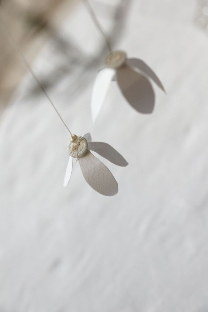 Mit Nadel und Faden eine Perle auffädeln … dann die beiden Blütenteile …… Danach entweder einen Knopf oder wieder eine Perle … die erste Perle wird fest verknotet …..der Rest reiht sich dann auf. Den übrigen Faden könnt ihr zum Aufhängen benutzen.