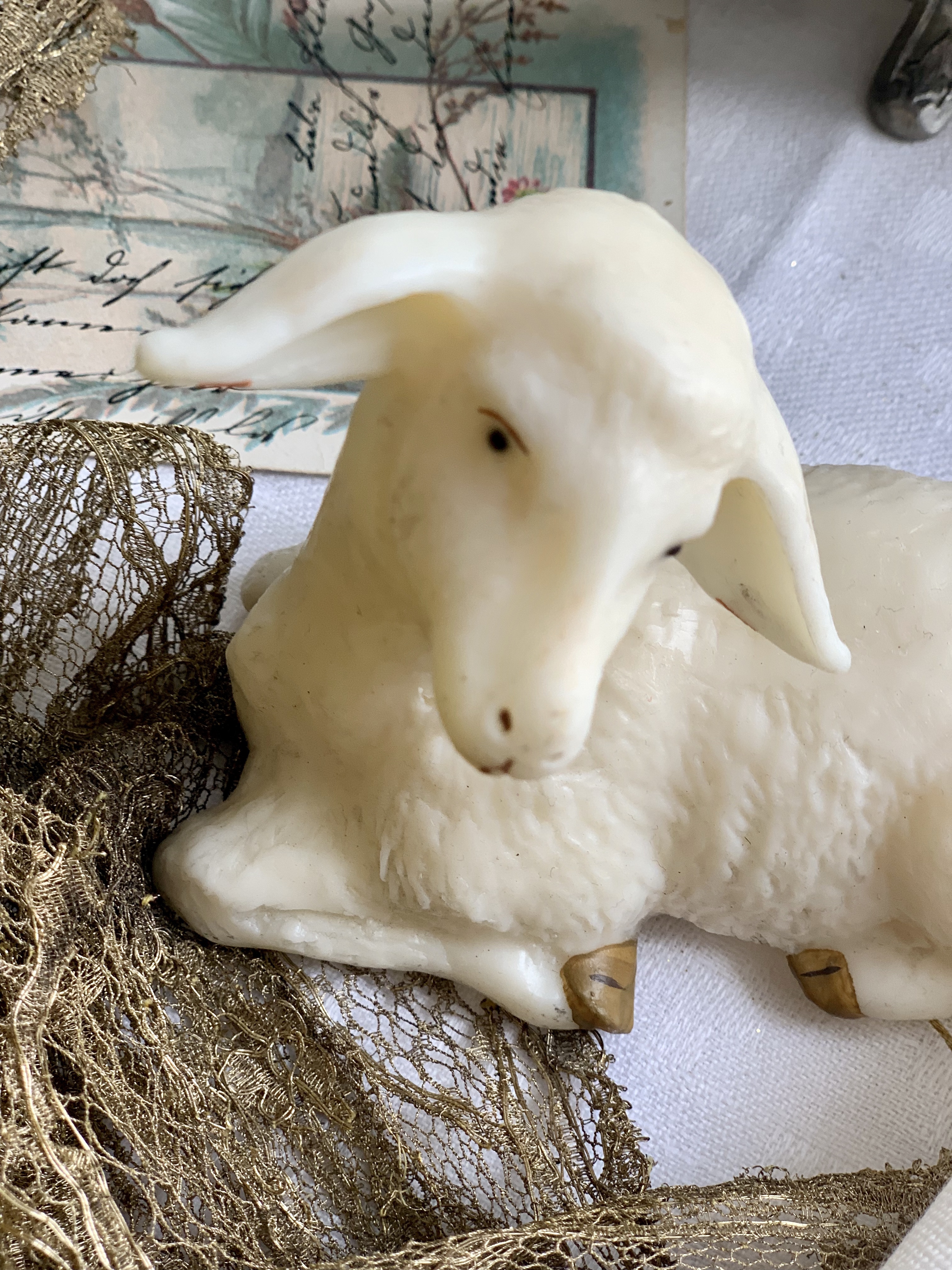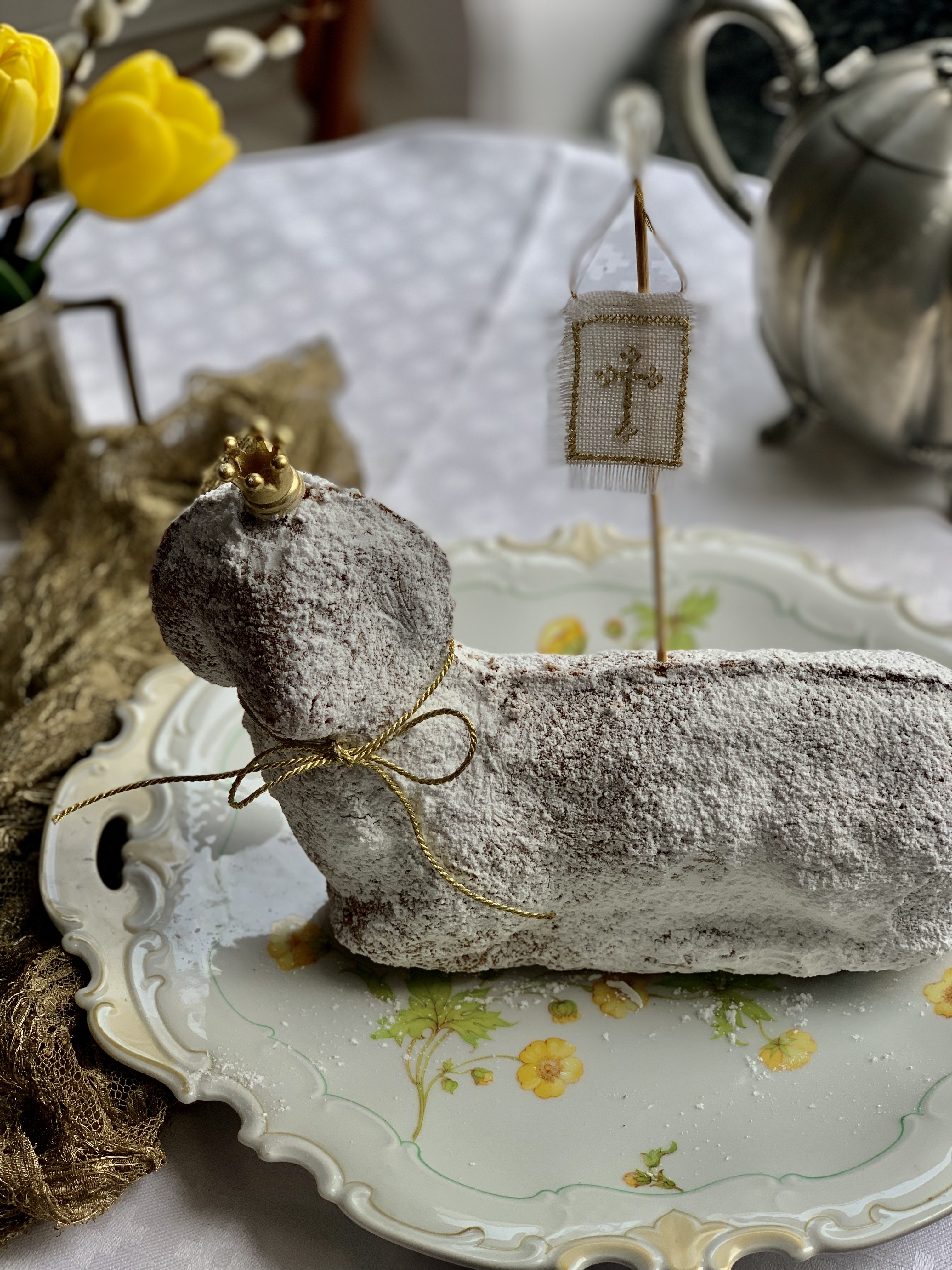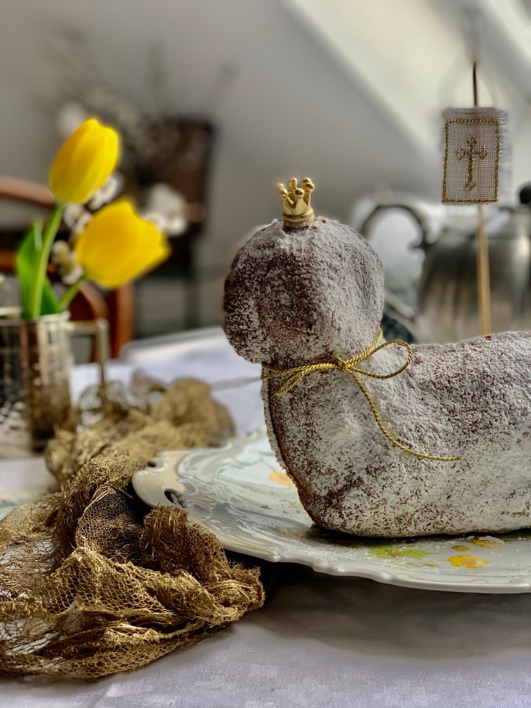 Ich setze diese Idee , schon etliche Jahre immer wieder farblich neu um.. diesmal in gold. Tante Reni aus Augsburg hat mir ein solches Fähnchen vor vielen Jahren.. damals in rot gestickt, zu Ostern geschenkt…. . Liebevoll verpackt… vielleicht für euch noch eine kleine Idee … eine kalorienarme und selbstgemachte Osterüberraschung für eure Lieben… mit gebackenem Lamm, entfällt natürlich das kalorienarm.