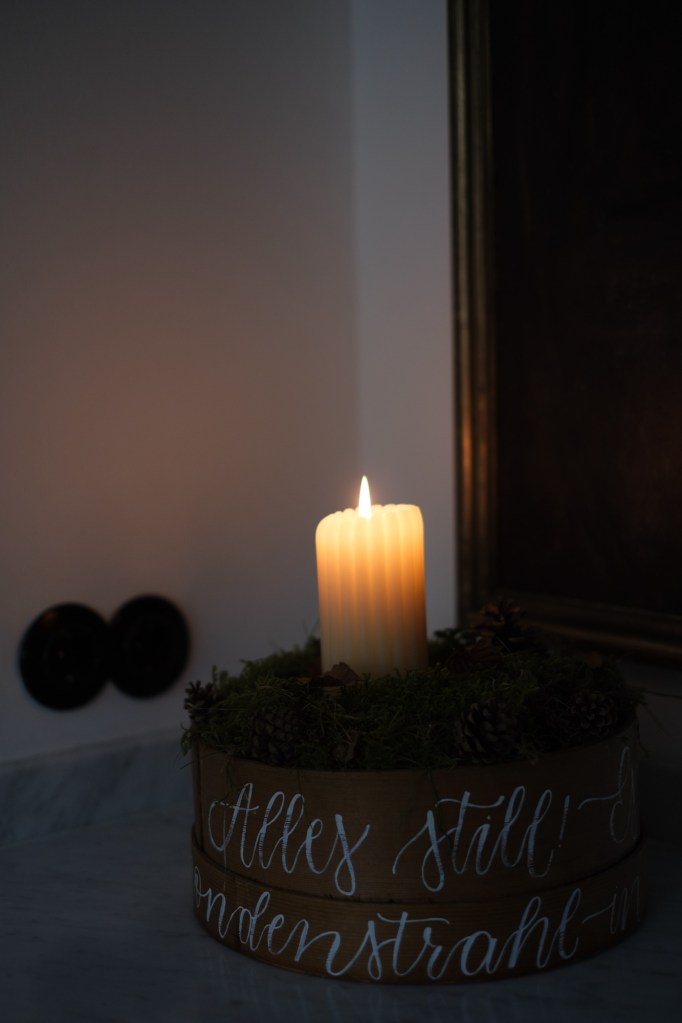 Ein alter Champagnerkübel aus den Zwanzigern, schwer von Patina und Geschichten, hält Buchenäste, als würde er einen frühen Wintergruß festhalten. Später, wenn der Advent wirklich beginnt, kommen die Kiefernzweige dazu – nicht früher, als die Zeit es erlaubt.