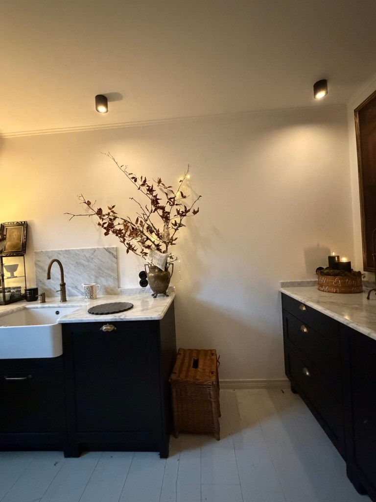 Die dunklen Schränke tragen die helle Marmorplatte wie eine Bühne, auf der jede Jahreszeit ihren Auftritt bekommt. Und genau jetzt – in diesem Zwischenmoment vor dem Advent – spielt die Küche ein erstes, leises Vorspiel.