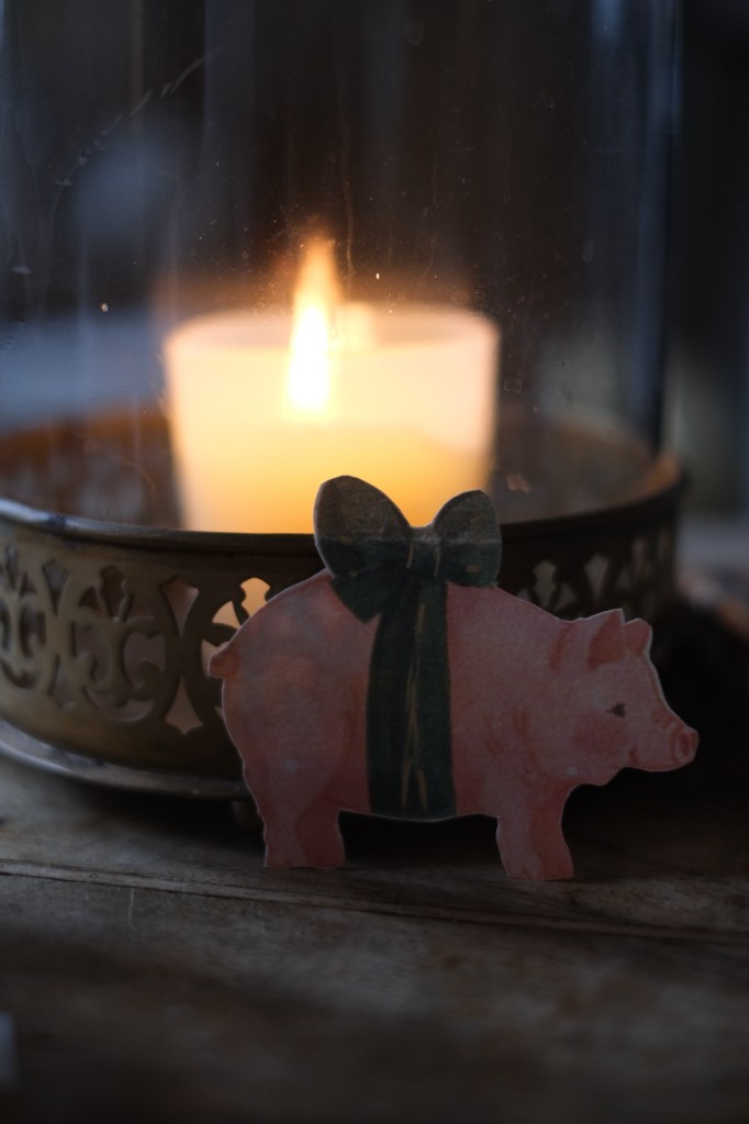 Schweinchen auf den Teller legen oder am Serviettenring / Besteck festbinden oder ans Glas hängen (sieht richtig festlich aus!)