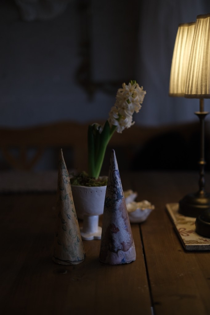 Deine selbst gestalteten Hütchen führen diese Tradition fort. Sie sind die modische Garderobe der Natur im Übergang. Indem du sie aus Papier fertigst, verleihst du der kühlen Glas-Wasser-Anatomie der Hyazinthe eine warme, menschliche Note. Es ist die Zähmung der Wildnis für den heimischen Esstisch: Ein kleiner, behüteter Wald auf einem Silberteller, der uns verspricht, dass unter jedem Kegel aus Papier bereits ein Duft von Mai und Meer verborgen liegt.